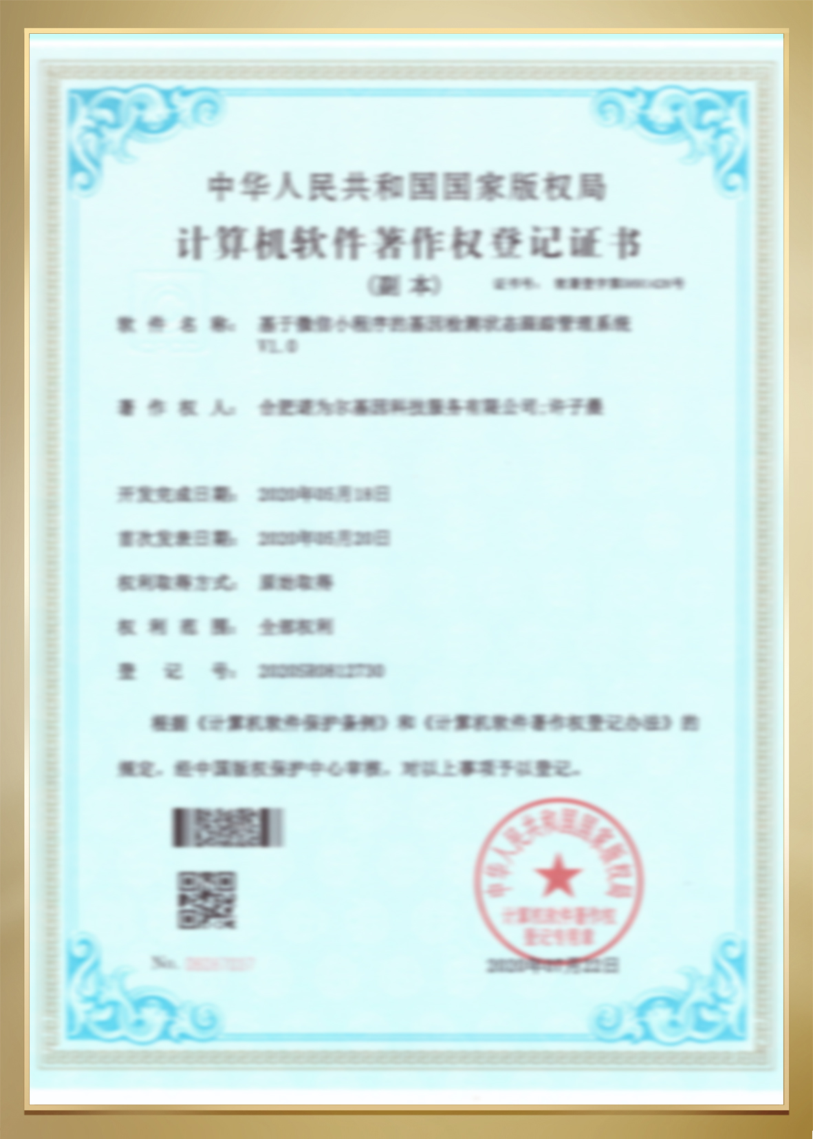 目前集團已獲得醫療機構執業許可證、臨床基因擴增檢驗實驗室資質,國家高新技術企業、安徽省科技型中小企業、合肥市大數據企業,獲得基因檢測試劑盒等發明專利、實用新型專利及軟件著作權40+項,并多次滿分通過國家臨檢中心的室間質評。